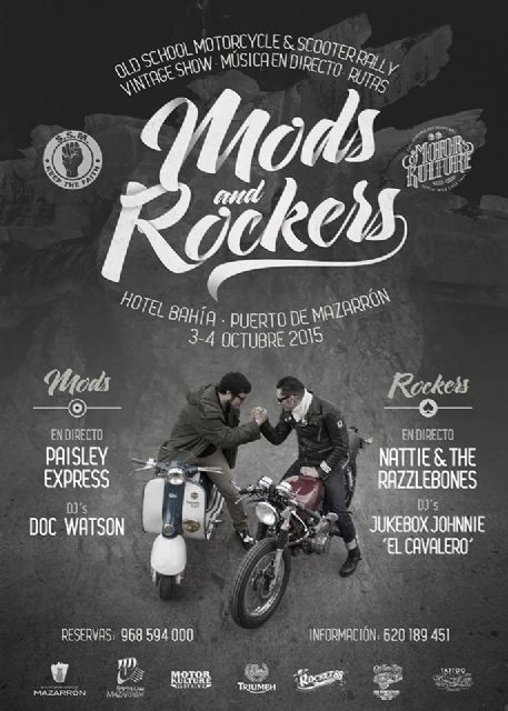Este sábado 3 y domingo 4 de octubre vuelve a Mazarrón “Mods and rockers”, concentración motera de ámbito nacional que atrae a numerosos seguidores de unos movimientos juveniles surgidos en los años 80 e inspirados en dos estilos musicales y estéticos opuestos propios de la década de los 60, escenificados en torno al tipo de vehículo de locomoción empleado. Desde hace tres años, la asociación cultural Motorkulture lleva tres años organizando en Mazarrón un encuentro muy popular que vuelve a repetir en 2015, esta vez utilizando el Hotel Bahía como  centro de operaciones.