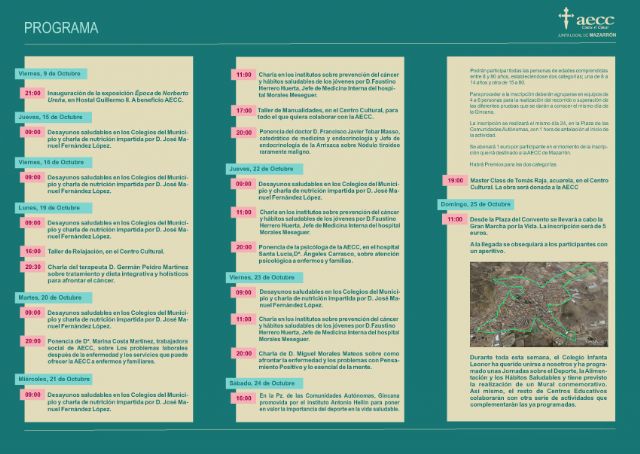 La I Semana por la Vida incluye desayunos saludables en los colegios, charlas de nutrición y terapéuticas y talleres de relajación a desarrollar en su conjunto en el Centro Cultural de Mazarrón. Han confirmado su asistencia el catedrático de medicina y jefe de endocrinología de la Arrixaca, Francisco Javier Tebar y el jefe de medicina interna del hospital Morales Meseguer, Faustino Herrero. Este último aconsejará, durante tres mañanas, a los jóvenes del municipio sobre cuáles son los mejores hábitos que pueden llevar para tratar de asegurar una vida saludable.