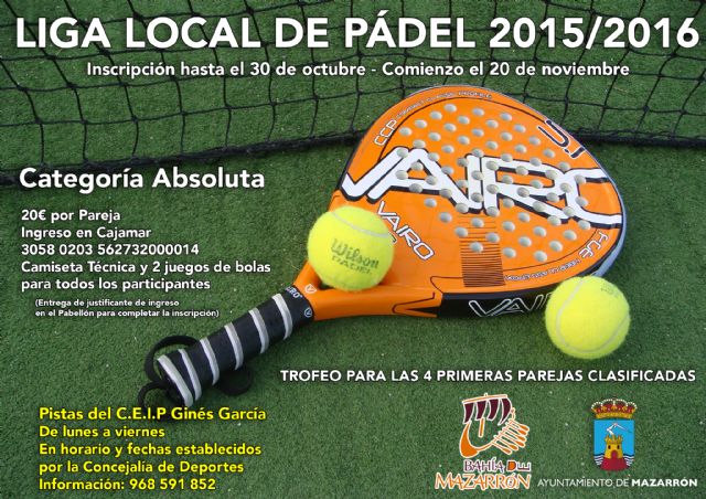 La Concejalía de Deportes del Ayuntamiento de Mazarrón vuelve a ofertar la Liga Local de Padel. El 30 de octubre acaba el plazo de inscripción que será de 20 euros por pareja. La liga se disputará en las pistas del CEIP Ginés García y los horarios de los partidos serán de 21 a 22:30 horas, de lunes a viernes. Las ocho mejores parejas jugarán las eliminatorias hasta llegar a la final. Las cuatro primeras parejas obtendrán un trofeo.