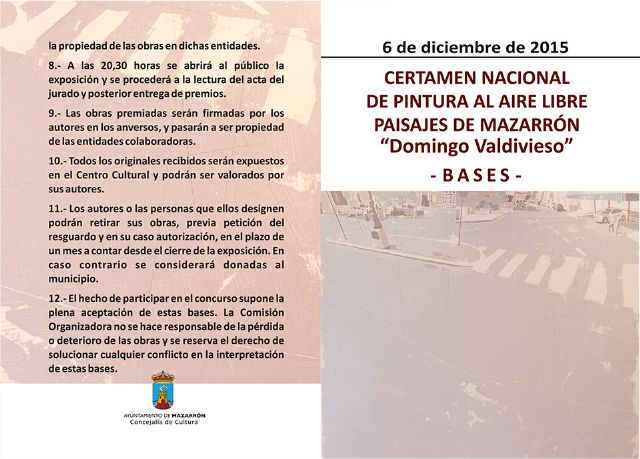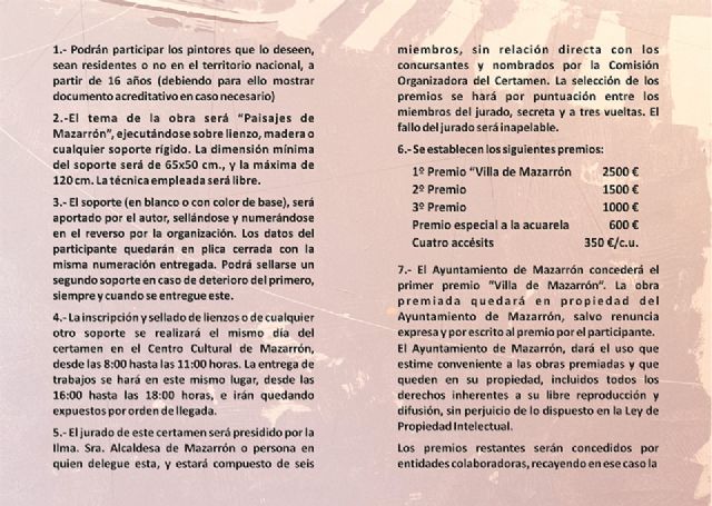 La Concejalía de Cultura ha publicado esta semana las bases de un concurso en el que podrán participar pintores mayores de 16 años residentes o no en el territorio nacional. El tema de la obra será "Paisajes de Mazarrón" y se plasmará sobre lienzo, madera o cualquier soporte rígido, siendo libre la técnica a emplear.