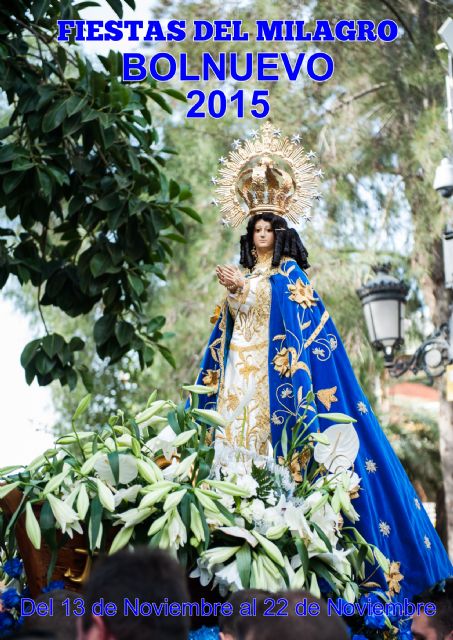 Patricio Sánchez, concejal de Festejos del Ayuntamiento de Mazarrón, ha presentado este lunes el programa de las Fiestas del Milagro 2015 que tendrán lugar del 13 al 22 de noviembre. Los mazarroneros tienen una cita en Bolnuevo con la Virgen del Milagro, la Purísima Concepción.