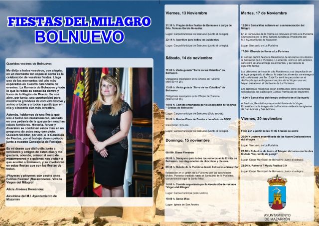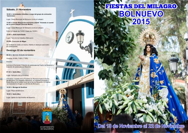 El domingo 15 de noviembre, a las 09:30 horas, tendrá lugar la Subida de la Patrona desde su ermita de Bolnuevo hasta la Iglesia de La Purísima en Mazarrón. Una semana más tarde, el domingo 22 de noviembre se celebrará la Santa Misa a las 07:30 horas. A su término se iniciará la popular Romería que llevará a la Virgen del Milagro hasta su ermita en Bolnuevo. Esta cita suele congregar año tras año a miles de personas.