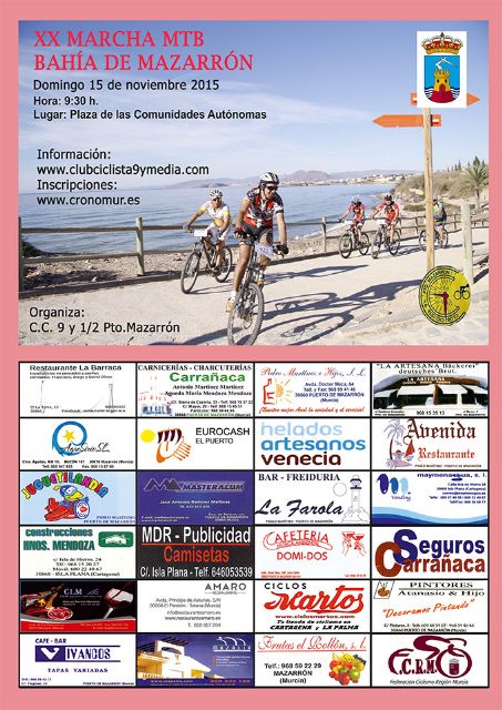 La cita es en la Plaza de las Comunidades de Puerto de Mazarrón, punto de salida y llegada de la prueba. A partir de las 09:30 horas saldrá el pelotón que rondará la cifra de 300 participantes. La marcha de mountain bike Bahía de Mazarrón es organizada por el Club Ciclista 9 y media en colaboración con la Concejalía de Deportes del Ayuntamiento de Mazarrón. Numerosos comercios y establecimientos comerciales patrocinan una prueba ya clásica que cumple su XX edición.