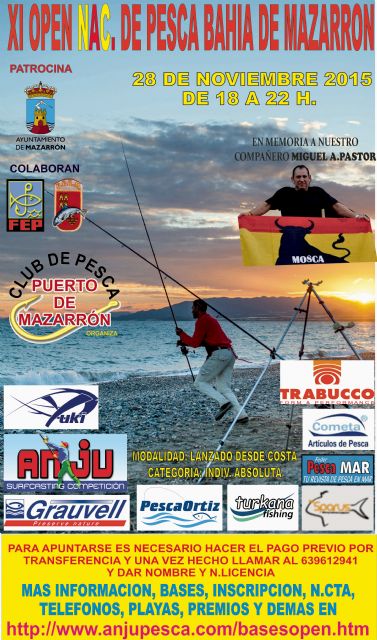 Las playas de Bolnuevo, Playa Grande, Alamillo e Isla Plana acogen este sábado 28 de noviembre el XI Open Nacional de Pesca Bahía de Mazarrón. Prueba que se disputará desde las 18 a las 22 horas y que, en esta edición, se realiza en memoria del aficionado Miguel Ángel Pastor.