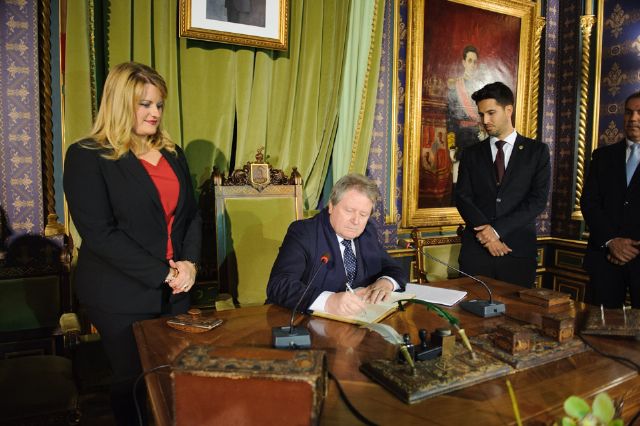 José María López Ballesta fue, este jueves, el encargado de pregonar las Fiestas Patronales de 2015. El director de la Universidad Popular de Mazarrón llegó a Casas Consistoriales acompañado de su mujer y de sus dos hijos. En el Salón de Plenos, en presencia de los miembros de la corporación municipal, firmó en el Libro de Honor del Consistorio, dejando así constancia del momento. Tras las fotos protocolarias se dirigió al Centro Parroquial flanqueado por las tres banderas institucionales portadas por la Policía Local y una representante de la Federación Española de Enfermedades Raras (FEDER), asociación a la que va destinada la donación del libro de las fiestas de este año.