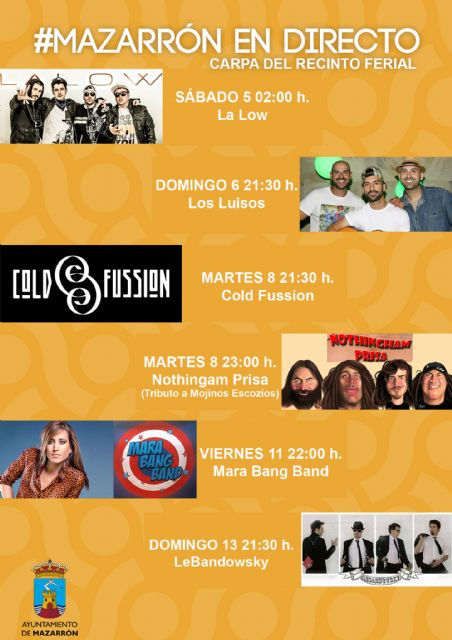 Patricio Sánchez, concejal de Festejos, ha animado a los mazarroneros a que disfruten de la música de los grupos de su tierra. "Hemos intentado tener en cuenta el estilo de cada grupo y el público que abarca para intentar agradar al mayor número de grupos de edad". Todos los conciertos son gratuitos y se desarrollarán en la Carpa Municipal Camino de los Rincones.