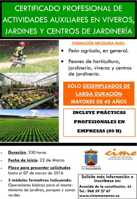 El 22 de marzo se inicia el curso para la obtención del Certificado Profesional de Actividades Auxiliares en Viveros, Jardines y Centros De Jardinería. Está dirigido, exclusivamente, a los desempleados de larga duración mayores de 45 años. Tendrá una duración de 330 horas y aportará contenido necesario para la formación de peón agrícola en general y peones de horticultura, jardinería, viveros y centros de jardinería. El plazo para presentar solicitudes quedará abierto hasta el 7 de marzo. Más información e inscripciones en la sede del CIME, en la Avenida de la Constitución, número 65 de Mazarrón, en el teléfono 968 59 27 67 y en la web www.cimemazarron.es.