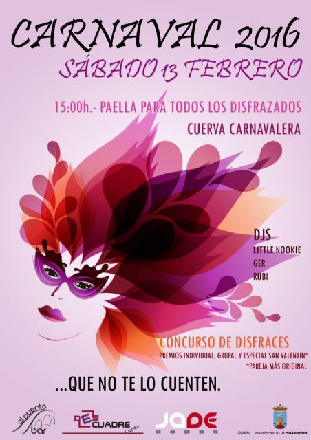 Mazarrón vivirá un nuevo fin de semana de Carnaval. El sábado 13 de febrero, la Carpa de Día, instalada en la parada de autobuses de la Avenida de la Constitución, acoge un concurso de disfraces ambientado con la actuación musical de los dj's locales Little Nookie, Ger y Rubi. A partir de las 15:00 horas habrá paella gratis y cuerva carnavalera para todos los que vayan disfrazados. La fiesta continuará en la Carpa de Día hasta las 23:00 horas. El tramo afectado de la Avenida de la Constitución (del cruce de con calle San José al cruce con calle Paloma) permanecerá cerrado el sábado de 14:00 a 00:00 horas.