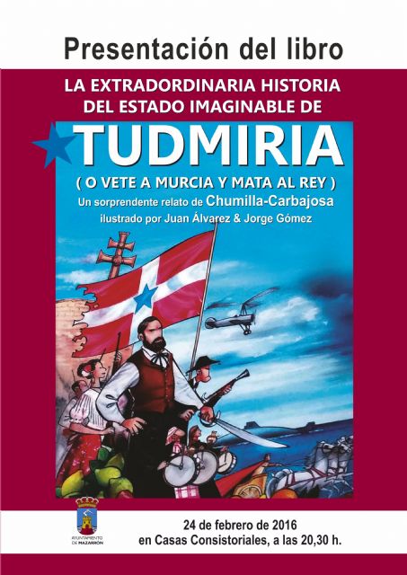 Juan Manuel Chumilla-Carbajosa, escritor y cineasta cartagenero de reconocida trayectoria en el panorama nacional, presentará el próximo miércoles 24 de febrero (20:30 horas) en las Casas Consistoriales de Mazarrón su libro "Tudmiria", una obra en la que combina ficción y realidad para tratar momentos de la historia de la Región de Murcia desconocidos para muchos de quienes hoy la habitan. Chumilla reivindica, con humor, elementos del patrimonio histórico de los murcianos. El autor aborda los movimientos nacionalistas que se dieron en momentos como la Revolución Cantonal, el Pacto de Tudmir y el Imperio Cartaginés.