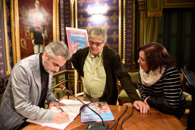 "La extraordinaria historia del Estado imaginable de Tudmiria" pasó este miércoles por Casas Consistoriales de la mano de sus creadores: el cineasta Juan Manuel Chumilla-Carbajosa y los dibujantes Jorge Gómez y Juan Álvarez. Presentación literaria que fue guiada por el concejal de Cultura, Pedro Martínez quien quiso agradecer al escritor y cineasta, así como a los ilustradores, su presencia en Mazarrón para presentar un libro que continuará con su gira en Barcelona el próximo sábado.