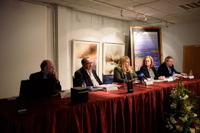 El Rector de la Universidad de Murcia, José Orihuela, inauguró este viernes la quinta edición de Phicaria (Encuentros Internacionales del Mediterráneo), enfocada en esta ocasión en la arqueología de las grandes capitales mediterráneas. La inauguración contó también con la presencia de la directora general de Bienes Culturales de la Comunidad Autónoma, María Comas, así como de la alcaldesa de Mazarrón, Alicia Jiménez. La planta baja de la Antigua Universidad Popular acoge unas jornadas culturales en la que participa una docena de ponentes y para la que se han inscrito 150 personas. En la mesa de presentaciones, Sebastián Ramallo, miembro del comité científico y codirector del curso y José María López, director de la Universidad Popular, entidad que, conjuntamente con el Ayuntamiento de Mazarrón y la Universidad de Murcia organizan una actividad que viene enmarcada dentro del programa de la Universidad Internacional del mar.
