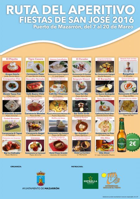 El concejal de Festejos del Ayuntamiento de Mazarrón, Patricio Sánchez, ha presentado este lunes la Ruta del Aperitivo organizada con motivo de las Fiestas de San José de Puerto de Mazarrón. En total son 28 establecimientos los que ofrecerán su mejor tapa a los clientes con derecho a bebida por un precio de dos euros. La actividad está patrocinada por Estrella de Levante y cuenta con la colaboración de Eurocash El Puerto. Patricio Sánchez ha señalado que con la Ruta del Aperitivo "se pretende motivar a mazarroneros y a visitantes para que disfruten de nuestra gastronomía". Por ello Sánchez ha agradecido a los establecimientos participantes el hecho de que se hayan sumado.