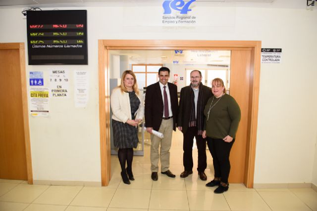 En la imagen, el director del SEF Alejandro Zamora(2i), junto con la alcaldesa de Mazarrón, Alicia Jiménez(1i), durante la visita a la Oficina de Empleo del municipio