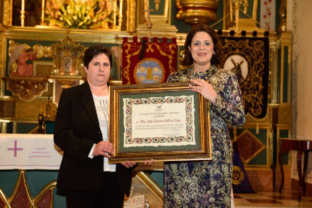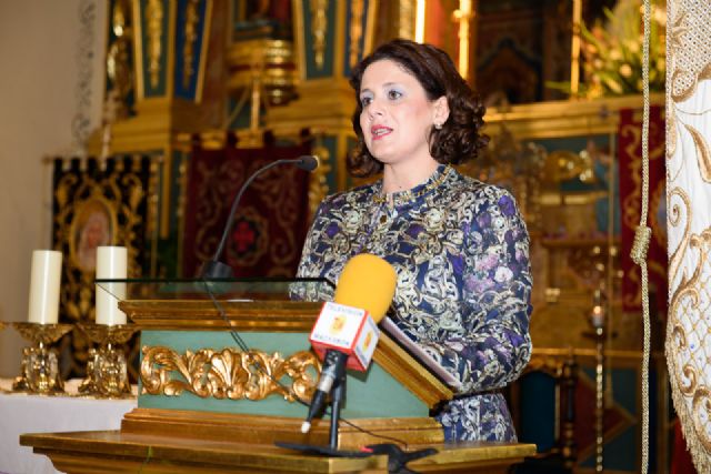 La pregonera, profesora del IES Antonio Hellín, leyó un pregón en el quedó reflejada su fe, sus años de vinculación a la parroquia y su amor a la Semana Santa. "No permitamos que la superficialidad y el folklore nos distraiga de nuestras obligaciones como cristianos", con este mensaje terminó su intervención que fue culminado con un fuerte aplauso de todos los asistentes. La presidenta del Cabildo de Cofradías de Mazarrón, Laly Agüera, le hizo entrega de un diploma conmemorativo.