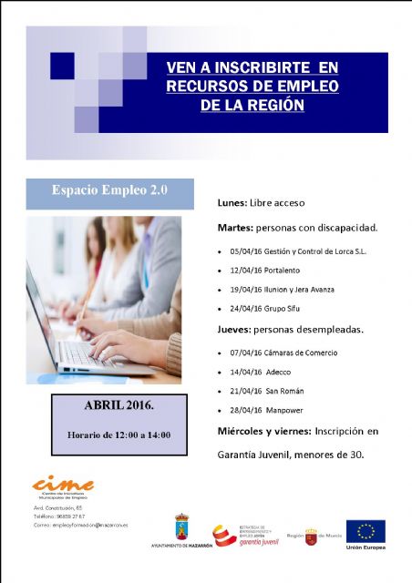 Como novedad este año, la Concejalía de Empleo ha habilitado a través del CIME un espacio que ayude al ciudadano a gestionar su búsqueda de empleo. Para ellos se va a abrir una de las aulas informáticas del CIME (Avenida de la Constitución, 65) durante dos horas (de 12 a 14 h.) con el fin de que quien lo necesite disponga de las herramientas necesarias para elaborar sus currículums. Cada día el aula estará centrada en una actividad, así los lunes tratará cuestiones relacionadas con el empleo y formación, los martes sobre la inscripción en recursos de empleo para personas con discapacidad, los miércoles en la inscripción en el Proyecto de Garantía Juvenil, los jueves en la inscripción en recursos de empleo para personas desempleadas y los viernes en la inscripción en Garantía Juvenil