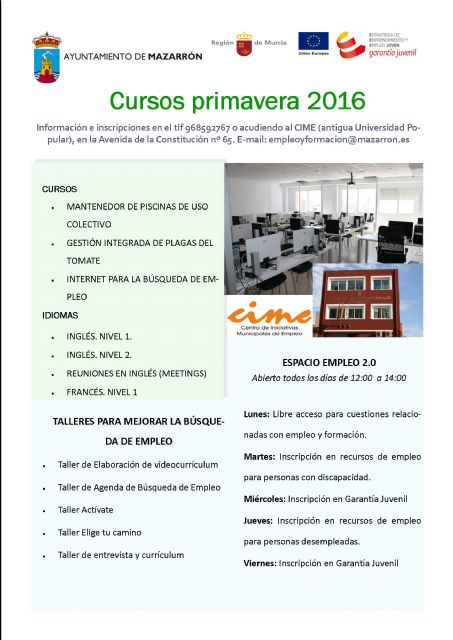 El Centro de Iniciativas Municipales de Empleo (CIME) de Mazarrón, dependiente de la Concejalía de Empleo y Desarrollo Local, oferta para esta Primavera nuevos cursos de formación e idiomas, así como talleres para mejorar la búsqueda de empleo. Los cursos son actividades específicas centradas en tres áreas: Gestión Integrada de Plagas de Tomate, Internet para Búsqueda de Empleo y Mantenedor de Piscinas de Uso Colectivo. También se ofertan dos cursos de inglés en los niveles 1 y 2 y otro específico de meetings, así como otro curso de francés. En cuanto a los talleres se siguen desarrollando los concernientes a la Elaboración de Videocurrículum, a la Agenda de Búsqueda de Empleo, a la elección de salida profesional y el encaminado a afrontar una entrevista de trabajo.