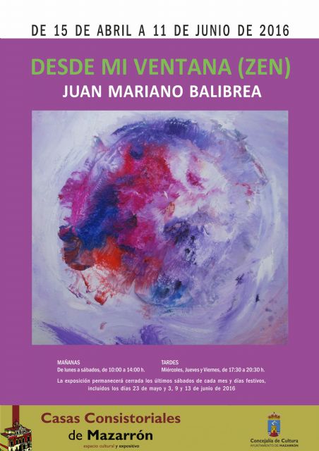 Juan Mariano Balibrea será el artista que exponga en Casas Consistoriales desde el 14 de abril y hasta el 11 de junio. El pintor murciano trae a Mazarrón su muestra "Desde mi ventana", un trabajo en el que el autor da rienda suelta al expresionismo abstracto que ha caracterizado gran parte de su obra. La exposición será inaugurada el próximo viernes a las 20:30 horas.