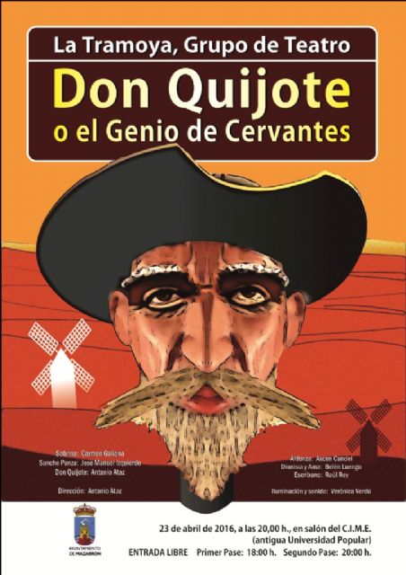 Mazarrón se suma a los actos conmemorativos del cuarto centenario de la muerte de Cervantes con la organización de una obra de teatro que acogerá el próximo sábado 23 de abril el salón de actos del CIME (Antigua Universidad Popular de Mazarrón) e interpretada por la compañía de teatro "Tramoya", cuyos integrantes presentaron el evento junto al concejal de Cultura del Ayuntamiento de Mazarrón, Pedro Martínez.