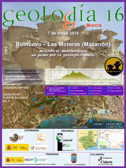 Se espera que varios centenares de personas participen en una ruta que comenzará en la explanada de las Erosiones de Bolnuevo a las 09:00 horas y recorrerá un total de 6,5 kilómetros con 8 paradas donde estarán distintos geólogos que con talleres y de forma didáctica explicarán las peculiaridades de la composición del paisaje geológico que irán visitando. "Esta ruta es conocida por muchos, pero el 7 de mayo la vamos a ver con ojos geológicos y sorprenderemos a la sociedad", así lo ha destacado Nacho Sierra, responsable de Gealand que este martes ha presentado la actividad junto a los concejales de Patrimonio y Medioambiente, Pedro Martínez Pagán y Francisco García Asensio.