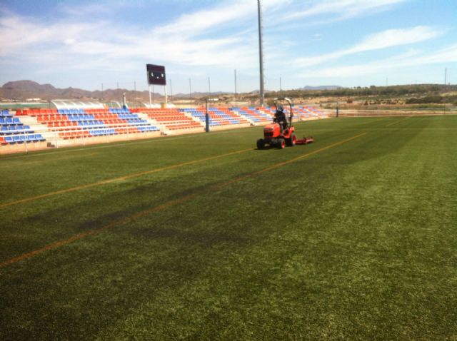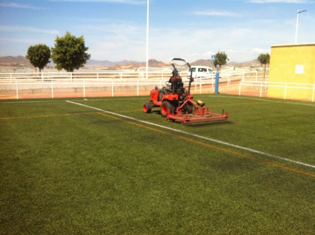Los campos de fútbol del Complejo Deportivo de Mazarrón están viendo optimizadas sus instalaciones gracias a los trabajos de mantenimiento que se llevan a cabo estos días. Gracias a ello se verá mejorado el césped de los dos terrenos de juego existentes. Los trabajos consisten en el cepillado para descompactar y redistribuir el relleno, obteniendo una limpieza total de la instalación. Además se ha procedido a la limpieza perimetral y de fondos obteniendo una mayor calidad del terreno.