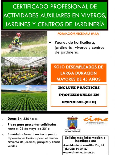 El Centro de Iniciativas Municipales de Empleo (CIME) de Mazarrón informa de los últimos días de inscripción para dos de sus cursos de formación: Tareas Auxiliares de Viveros, Jardines y Centros de Jardinería y Curso de Organización del Transporte y la Distribución. Para ambos, el plazo para presentar solicitudes finaliza el viernes 6 de mayo.