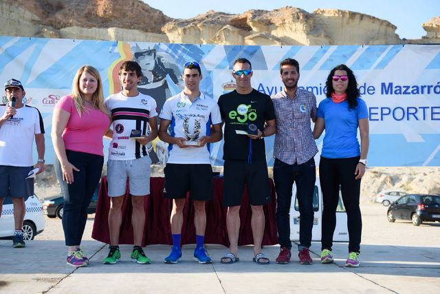 Pedro Antonio López y Alfonsina Rivedieu se proclamaron el pasado sábado campeones absolutos del III Triatlón Bahía de Mazarrón. La prueba comenzó en la playa de Bolnuevo con los 750 metros a nado previstos. Finalizada esta primera parte, los participantes se dirigieron a los boxes instalados en la explanada de las Erosiones de Bolnuevo para comenzar la prueba ciclista que recorrió la RM-D6 bordeando la Sierra de las Moreras, hasta completar un itinerario de 20 kilómetros con meta en Bolnuevo. Una vez allí los triatletas finalizaron la prueba con un circuito de carrera a pie de 5 kilómetros por el Paseo de Bolnuevo.
