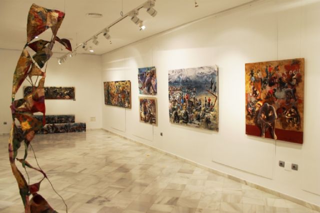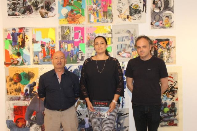 Juan Antonio Cortés Abellán expone desde el pasado viernes en Casas Consistoriales de Mazarrón la muestra "Éxodos", que fue inaugurada por la concejal de Turismo, María Ángeles Román junto al artista y el comisario de la exposición, Juan Francisco Martínez.