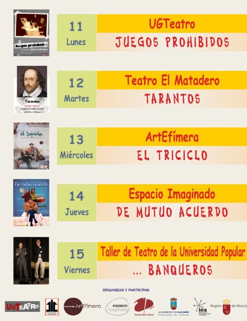 Las obras a representar responden a temáticas variadas y tratarán de satisfacer a todos los públicos. El calendario de representaciones comienza el lunes 11 de julio con "Juegos Prohibidos", de UGTeatro. El martes 12 de julio será el turno para "Tarantos", del grupo de teatro "El matadero". El miércoles 13 de julio se escenificará "El triciclo" de ArtEfímero. El jueves 14 de julio, "De mutuo acuerdo", de "Espacio imaginado" y el viernes 15 de julio, "Banqueros", adaptación teatral de Rafael García Castillo interpretada por el Taller de Teatro de la Universidad Popular, durante el pasado "Mayo Cultural". La presentación del evento ha contado con la asistencia del director del grupo de teatro "El matadero" y del concejal de Cultura, Pedro Martínez.