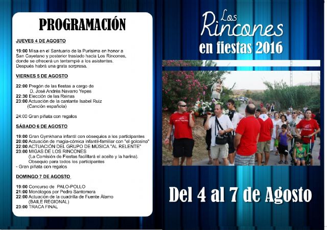 La pedanía mazarronera de Los Rincones celebra del 4 al 7 de agosto sus fiestas patronales en honor a San Cayetano. Los festejos comienzan este jueves 4 de agosto con la tradicional Misa en el Santuario de la Purísima y posterior procesión con traslado de la imagen de San Cayetano hasta Los Rincones. A su término se ofrecerá un tentempié a los presentes, seguido de una sorpresa preparada por la Comisión de Fiestas.