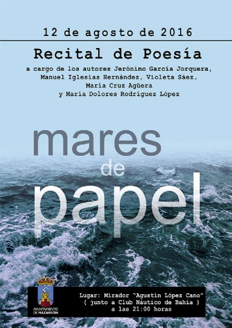 Seis poetas locales participarán este viernes (21:00 horas) en una nueva edición del exitoso recital "Mares de Papel" que vuelve un mes después para ofrecer un nuevo atardecer dedicado a la Cultura en una de las localizaciones con mejores vistas de la costa de Mazarrón. El mirador "Agustín López Cano", junto al club de Regatas, acogerá las lecturas de Jerónimo García Jorquera, Manuel Iglesias Hernández, Violeta Sáez, María Cruz Agüera y María Dolores Rodríguez López.