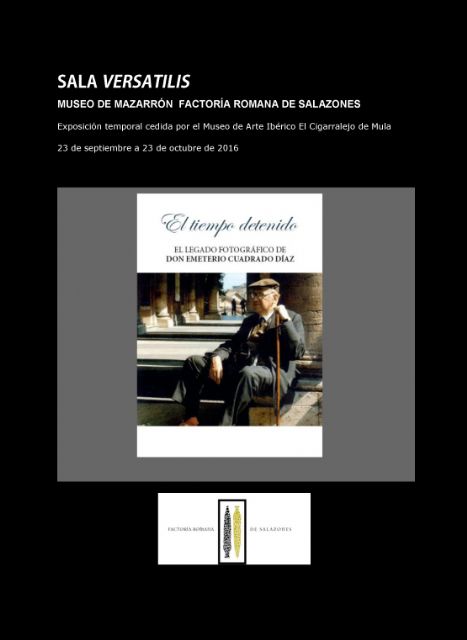 El Ayuntamiento de Mazarrón inaugura este viernes 23 de septiembre, a las 21 horas, la sala denominada VERSATILIS, en el Museo de Mazarrón "Factoria Romana de Salazones" con la exposición "EL TIEMPO DETENIDO. El legado fotográfico de D. Emeterio Cuadrado.
