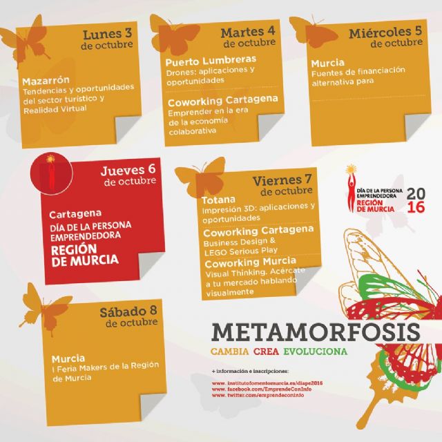 Junto a Mazarrón son cuatro municipios más (Puerto Lumbreras, Murcia, Totana y Cartagena) los que albergarán distintas ponencias enmarcadas dentro de los actos del décimo aniversario del Día de la Persona Emprendedora (DIAPE), evento reconocido a nivel nacional que se lleva realizando en la Región de Murcia desde 2006.