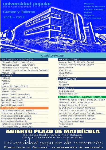 El próximo viernes finaliza el plazo de matrícula de la nueva programación de cursos de la Universidad Popular de Mazarrón. Este año como novedad se han incorporado a la oferta formativa cuatro pedanías del municipio: Cañada de Gallego, La Majada, Bolnuevo y El Saladillo-Camposol. Lugares que suman a las sedes ya tradicionales en el Centro Cultural de Mazarrón y en la calle San Hilario de Puerto de Mazarrón.
