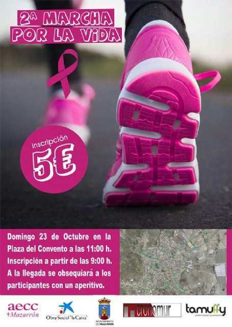 La Junta Local de la Asociación Española contra el Cáncer (AECC) celebra el próximo domingo 23 de octubre la II Marcha por la Vida. Actividad solidaria organizada en colaboración con el Ayuntamiento de Mazarrón que tendrá salida, a partir de las 11:00 horas, desde la Plaza del Convento de Mazarrón. En el mismo lugar, dos horas antes (9:00 h.) comenzarán las inscripciones. La Junta Local ofrecerá buñuelos con chocolate a los participantes. El precio de inscripción, incluyendo camiseta, será de 5 euros.