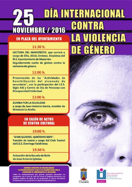 Los actos del viernes 25 de noviembre comenzarán a las 11:30 horas con la Lectura del Manifiesto Institucional, a cargo de la alcaldesa de Mazarrón, en la Plaza del Ayuntamiento. Seguidamente tendrá lugar una “Suelta de Globos” de color malva como símbolo de rechazo a la violencia de género. A las 12:00 horas se procederá a la “Presentación de las Actividades de Sensibilización del Alumnado de Secundaria” con la participación de los alumnos del Colegio Siglo XXI y usuarios del Centro de Día de Personas con Discapacidad. A las 13:00 horas, Juan Antonio García, monitor del Gimnasio La Aceña, estará al frente de la actividad “Zumba por la Igualdad”.