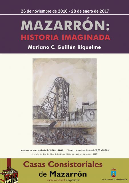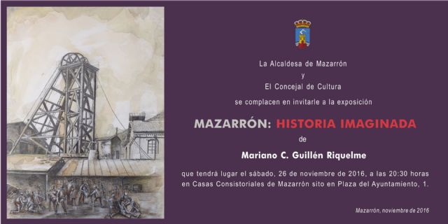 Mariano Guillén vuelve a exponer en Mazarrón una nueva muestra que proyecta sus facetas investigadora y divulgadora. Quien también es Cronista Oficial de la Villa nos presenta "Mazarrón: Historia Imaginada", una colección de obras en las que combina diversas técnicas que retrotraerá al espectador al pasado histórico del municipio, destacando momentos o escenas en los que quedan reflejados la imaginación y el espíritu inquieto de Guillén.