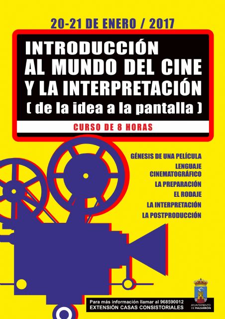 El cineasta y escritor Benito Rabal impartirá en Mazarrón el viernes 20 y el sábado 21 de enero un taller gratuito titulado "Introducción al mundo del cine y la interpretación (De la idea a la pantalla)". La actividad se llevará a cabo finalmente en el aula 2.3 del Centro de Iniciativas Municipales de Empleo (CIME) de Mazarrón en horario de 17:00 a 21:00 horas el viernes y de 10:00 a 14:00 horas el sábado. Dada la buena acogida esta oferta formativa, la Concejalía de Cultura amplió el número de plazas a 25, siendo cubiertas en su totalidad. Tras la ampliación de plazas, para dar mayor comodidad a la realización del curso se ha optado por el cambio de ubicación ya que, en un principio, estaba previsto que el taller se impartiera en la planta baja de Casas Consistoriales.