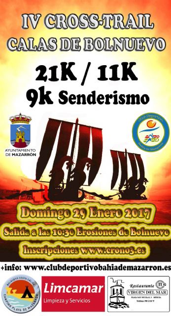 La Concejalía de Deportes del Ayuntamiento de Mazarrón y el Club Deportivo Bahía de Mazarrón organizan, este domingo 29 de enero, el IV Cross Trail Calas de Bolnuevo. Dos pruebas de 21 y 11 kilómetros quellevarán a participar amás de 450 corredores de la Región de Murcia y de provincias limítrofes. Este año, como novedad, la organización ha incluido una marcha senderista de 9 kilómetros. Las inscripciones aún abiertas se cierran el próximo miércoles y se pueden formalizar en la web https://www.clubdeportivobahiademazarron.es/.