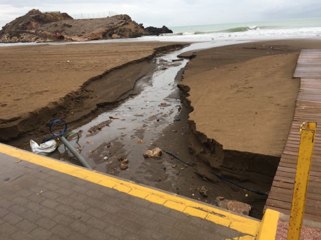El importe de las obras en el Término Municipal de Mazarrón, que estarán finalizadas antes de final de mes, asciende a 210.000 euros y se engloban en los 4,6 millones de euros que el Plan Litoral 2017 concede a la región de Murcia para la reparación de esos daños, que consisten, básicamente, en pérdidas de arena, daños en paseos marítimos, pérdidas de pasarelas y desprendimientos.