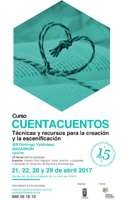 La Concejalía de Juventud del Ayuntamiento de Mazarrón ha organizado para finales del próximo mes de abril un taller para profundizar en la técnica y recursos para la creación y escenificación de Cuentacuentos. La actividad será impartida por Hábitat Cultural en el IES Domingo Valdivieso de Mazarrón los días 21, 22, 28 y 29 de abril. En total son 24 horas de cursos repartidas en sesiones de viernes por la tarde y de sábados por la mañana y por la tarde.