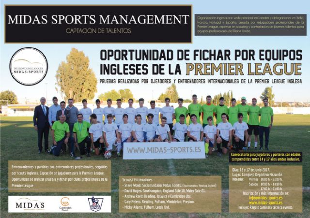 Profesionales de la Premier League estarán en el Complejo Deportivo de la Media Legua de Mazarrón el viernes 16 y el sábado 17 de junio con motivo de un Campus de Fútbol organizado por Midas Sport Management, en colaboración con la Concejalía de Deportes del Ayuntamiento de Mazarrón. La delegación británica estará asistida por profesionales nacionales, entre ellos Carlos Perelló, actual entrenador de porteros del Jumilla, así como de personal técnico relacionado con el Orihuela Club de Fútbol.