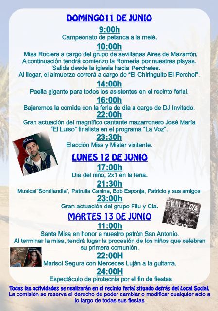 Los vecinos de Cañada de Gallego ya viven sus fiestas patronales en honor a San Antonio, a celebrar entre el 7 y el 13 de junio. La programación cuenta este año con dos actuaciones musicales destacadas: la de cantante mazarronero José María "El Luiso", tras su exitoso paso por el programa "La Voz" de Telecinco y la de "Los Happys", un grupo muy conocido en Mazarrón por su presencia en las dos ediciones de "La Isla Fun Fest". El Luiso actuará el domingo 11 de junio y "Los Happys" de Antonio Hidalgo lo harán un día antes, el sábado 10 de junio.