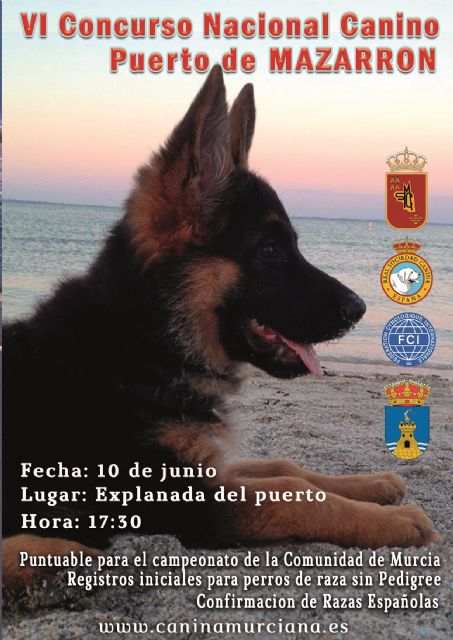 La prueba, puntuable para el campeonato autonómico, abrirá un periodo de inscripción a las 17:30 horas. A las 19:00 tendrá lugar la inauguración del evento con registro inicial de los perros de pura raza que se presenten a obtener pedigree, confirmación de razas españolas, concurso de presentadores infantiles y juveniles y elección del mejor ejemplar del socio de la Sociedad Canina de Murcia.