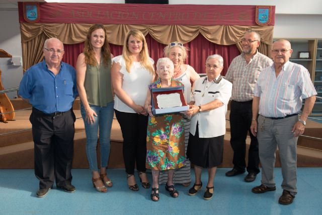 Leonor Gutiérrez García recibió el reconocimiento al Socio de Mayor edad. Esta mazarronera de 95 años mostró su agradecimiento y dedicó unas cariñosas palabras a los presentes.