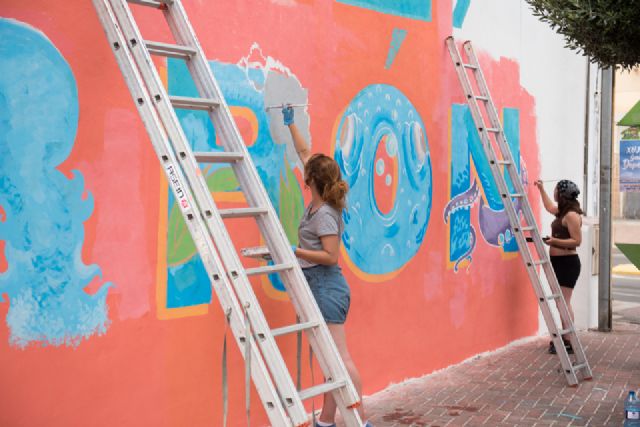 Este jueves se podrá ver el resultado final, aunque ya son muchos los curiosos los que intentan vislumbrarlo. Desde principios de semana, 15 alumnos del Ciclo Formativo de Grado Superior de la Escuela de Arte de Murcia pintan un mural de 265 metros cuadrados que ocupa un espacio neutro en una zona de céntrica y de paso para centenares de viandantes como es el entorno de la Plaza Toneleros de Puerto de Mazarrón.