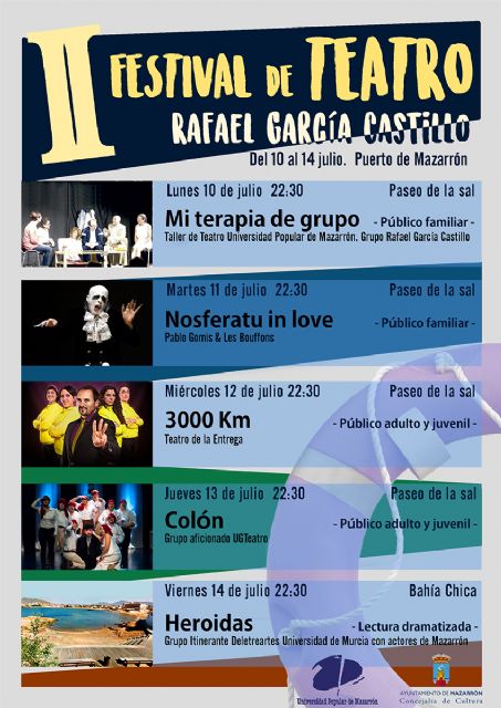 La próxima semana vuelve al Paseo de la Sal de Puerto de Mazarrón el Festival de Teatro "Rafael García Castillo". Segundo edición de un certamen que tuvo una gran acogida en su primer año, con la asistencia de más de 2.200 persona. El festival se llevará a cabo del lunes 10 al jueves 13 de julio en el Paseo de la Sal de Puerto de Mazarrón y será clausurado el viernes 14 de julio en la playa de Bahía Chica. Todas las actuaciones tendrán lugar a partir de las 22:00 horas.
