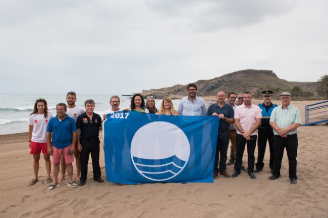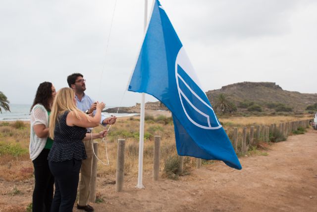 Ocho banderas azules ondean desde este viernes en la costa de Mazarrón. Manuel Fernández-Delgado, director del Instituto de Turismo ha acompañado a la alcaldesa, Alicia Jiménez, en el acto protocolario de izado que, en esta ocasión, ha tenido lugar en Percheles, playa que se ha sumado este año al reconocimiento de un distintivo que habla de calidad del baño en el litoral.