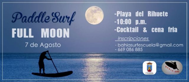Bahía Surf en colaboración con la concejalía de Deportes del Ayuntamiento de Mazarrón ofrece un plan diferente para la noche del 7 de agosto. Coincidiendo con la luna llena, a partir de las 22:00 horas en la playa de El Rihuete, oferta salidas en paddle surf que permitirán contemplar las vistas de la bahía desde el mar.