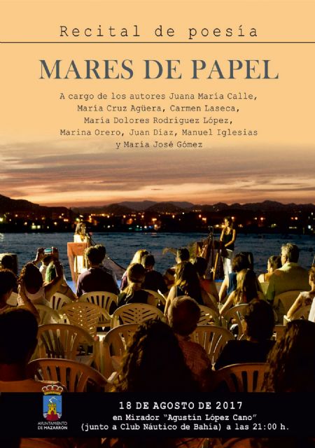 El mirador "Agustín López Cano" de Bahía, junto al Club de Regatas, acoge este viernes 18 de agosto (21:00 horas) una nueva edición del recital de poesía "Mares de papel que organiza la Concejalía de Bibliotecas del Ayuntamiento de Mazarrón. Tras el recital del pasado 28 de julio vuelve un evento que aprovecha a la perfección el entorno natural que ofrece la bahía de Mazarrón. Se trata de una actividad de acceso libre y gratuito que lleva registrando un excelente acogida entre el público asistente.