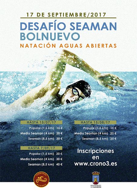 Queda menos de un mes para vivir un nuevo "Desafío Seaman" en aguas de la bahía de Mazarrón. Esta vez será en Bolnuevo, donde el próximo domingo 17 de septiembre tendrá lugar entre las calas y la playa principal una nueva competición de natación en aguas abiertas. Se trata de un evento que regresa tras el éxito experimentado en anteriores travesías como la de La Azohía-Puerto de Mazarrón de 2016 y la de La Isla durante el pasado festival Fun Fest.